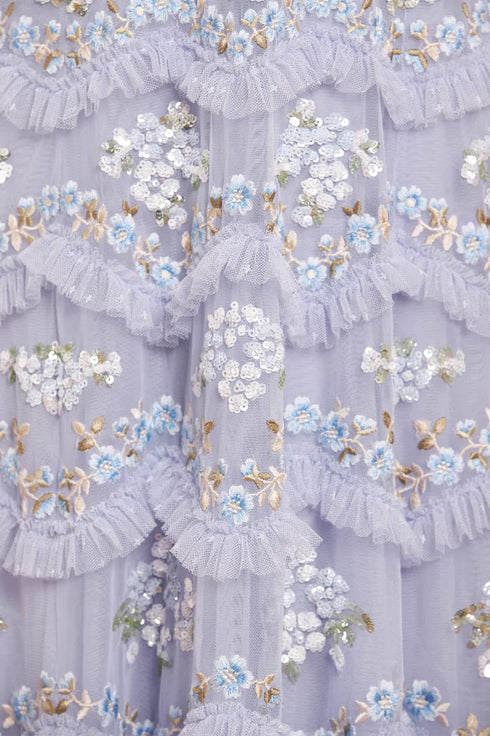 The Daisy Wave Ankle Gown in Iris Blue. The artwork for this style has been inspired by our 'Daisy Wave' print. Exquisitely detailed textile is created using undulating borders of gathered tulle frills with interspersed intricate lace. Featuring floral artworks with rich, tonal embroidery and shimmering sequins. The perfect gown to take you from day to night.