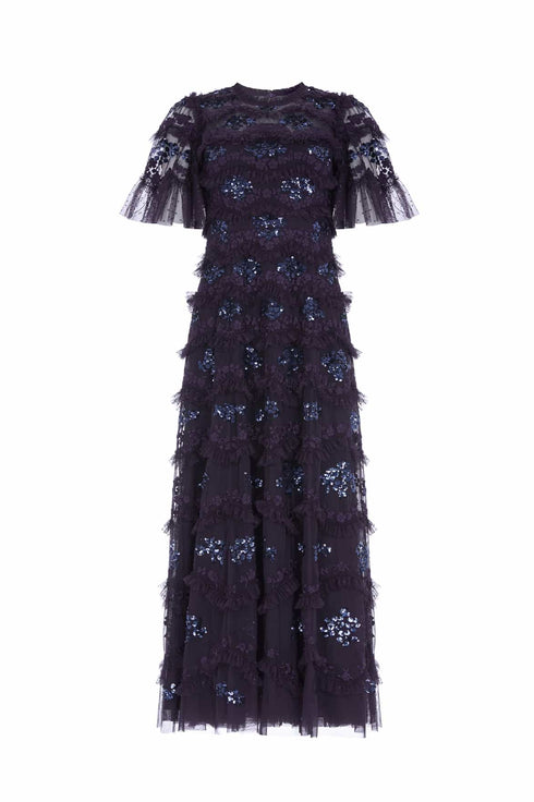 The Daisy Wave Ankle Gown in Midnight. The artwork for this style has been inspired by our 'Daisy Wave' print. Exquisitely detailed textile is created using undulating borders of gathered tulle frills with interspersed intricate lace. Featuring floral artwork with rich, tonal embroidery and shimmering sequins. The perfect gown to take you from day to night.