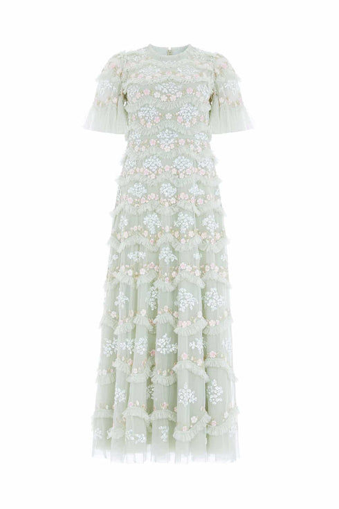 The Daisy Wave Ankle Gown in Mist is inspired by our signature 'Daisy Wave' print. This exquisite design features undulating tulle frills, intricately interwoven with lace, and floral embroidery enhanced with shimmering sequins. With its refined detailing, this gown effortlessly transitions from day to night, offering timeless elegance.