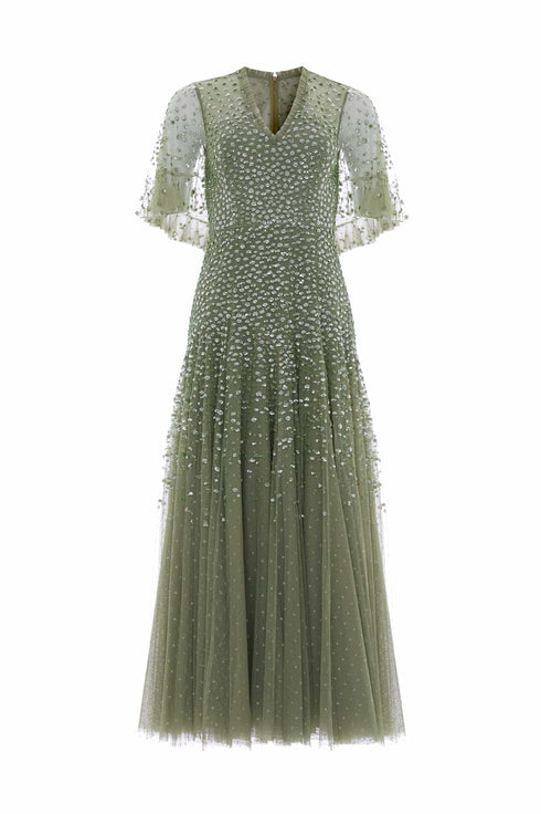 The Dappled Sequin Cape Ankle Gown in Fern. A gracefully romantic design for the This ethereal gown features an integrated cape with softly gathered frill detailing, adding fluid movement and a touch of drama. Crafted with delicate clusters of shimmering sequins intricately scattered across the fabric, creating a light-catching, dappled effect. Designed with signature Needle & Thread tulle ruffles framing the neckline, while chevron seaming sculpts the waist and hips before falling into a voluminous, frothy skirt. Crafted from generous layers of net and tulle, this gown is destined for truly unforgettable moments.