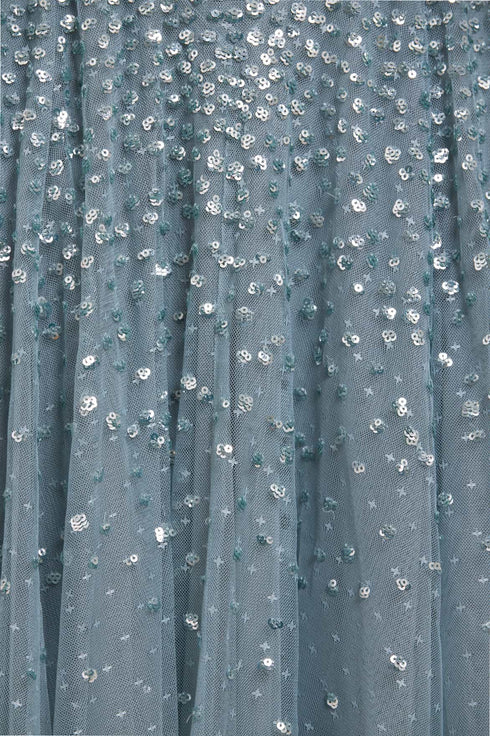 The Dappled Sequin Cape Ankle Gown in Thistle Blue. A gracefully romantic design for the This ethereal gown features an integrated cape with softly gathered frill detailing, adding fluid movement and a touch of drama. Crafted with delicate clusters of shimmering sequins intricately scattered across the fabric, creating a light-catching, dappled effect. Designed with signature Needle & Thread tulle ruffles framing the neckline, while chevron seaming sculpts the waist and hips before falling into a voluminous, frothy skirt. Crafted from generous layers of net and tulle, this gown is destined for truly unforgettable moments.