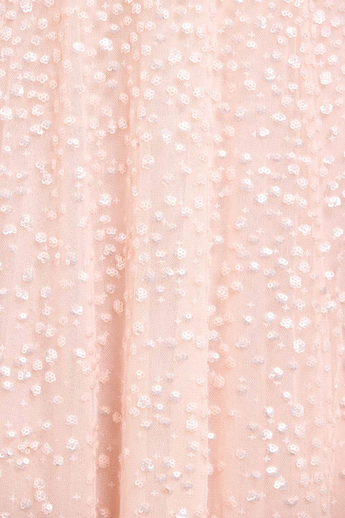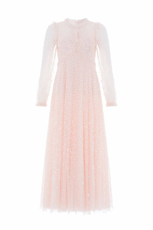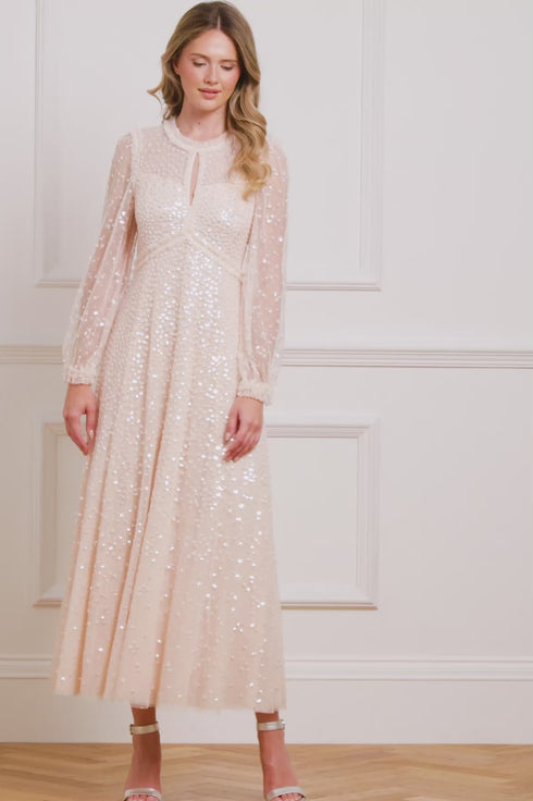 NEW SEASON. The Dappled Sequin Long Sleeve Ankle Gown in Opal. This look offers a soft and feminine take on evening sparkle. Tiny sequins are meticulously placed across the tulle fabric, fading towards the hem to create a celestial effect. The flattering long sleeves and ankle-length skirt make it a standout choice.