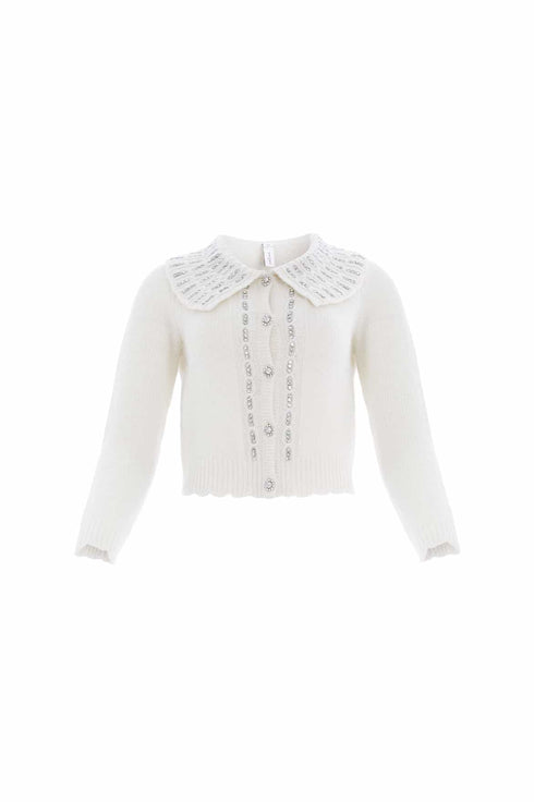 The Embellished Collar Short Cardigan in Cream. This embellished cardigan is developed from alpaca yarn, creating a soft, fluffy texture. Designed with a short silhouette, slim fit sleeves and signature Needle & Thread scallop detailing on the cuff and hem. This pretty style is beautifully crafted with diamante jewel buttons, a bib-neck collar and framed with crystal gems for a feminine look. This elegant style is a new season favourite.