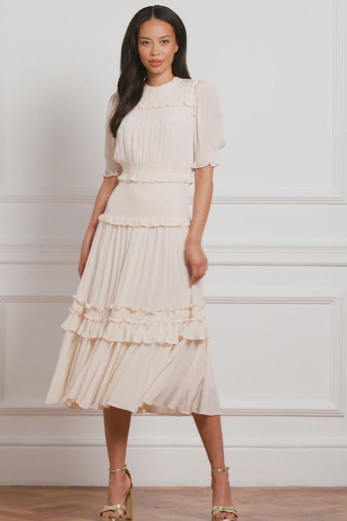 NEW SEASON. The Emilia Crepe Ballerina Dress in Opal. This dress features a soft matte crepe fabric tailored into a flattering mid-length silhouette. With a fitted bodice, floaty skirt and delicate gathering, this piece is ideal for elegant styling.