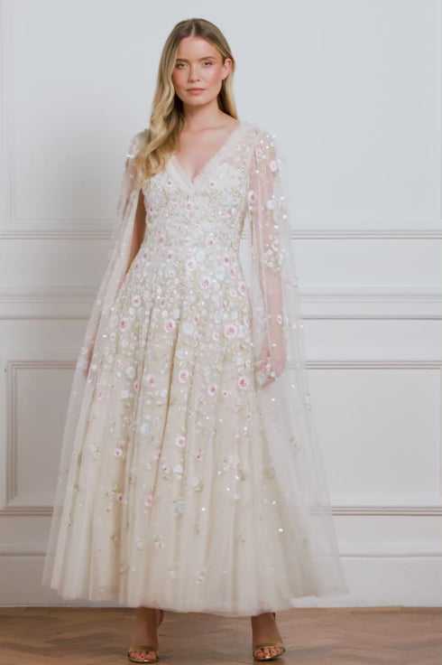 NEW SEASON. The Ethereal Blooms Cape Sleeve Ankle Gown in Cream/Multi. Decorated with soft floral embroidery in shimmering pastel tones. Designed with flowing cape sleeves and a gentle A-line silhouette, this gown embodies delicate femininity and effortless sophistication.