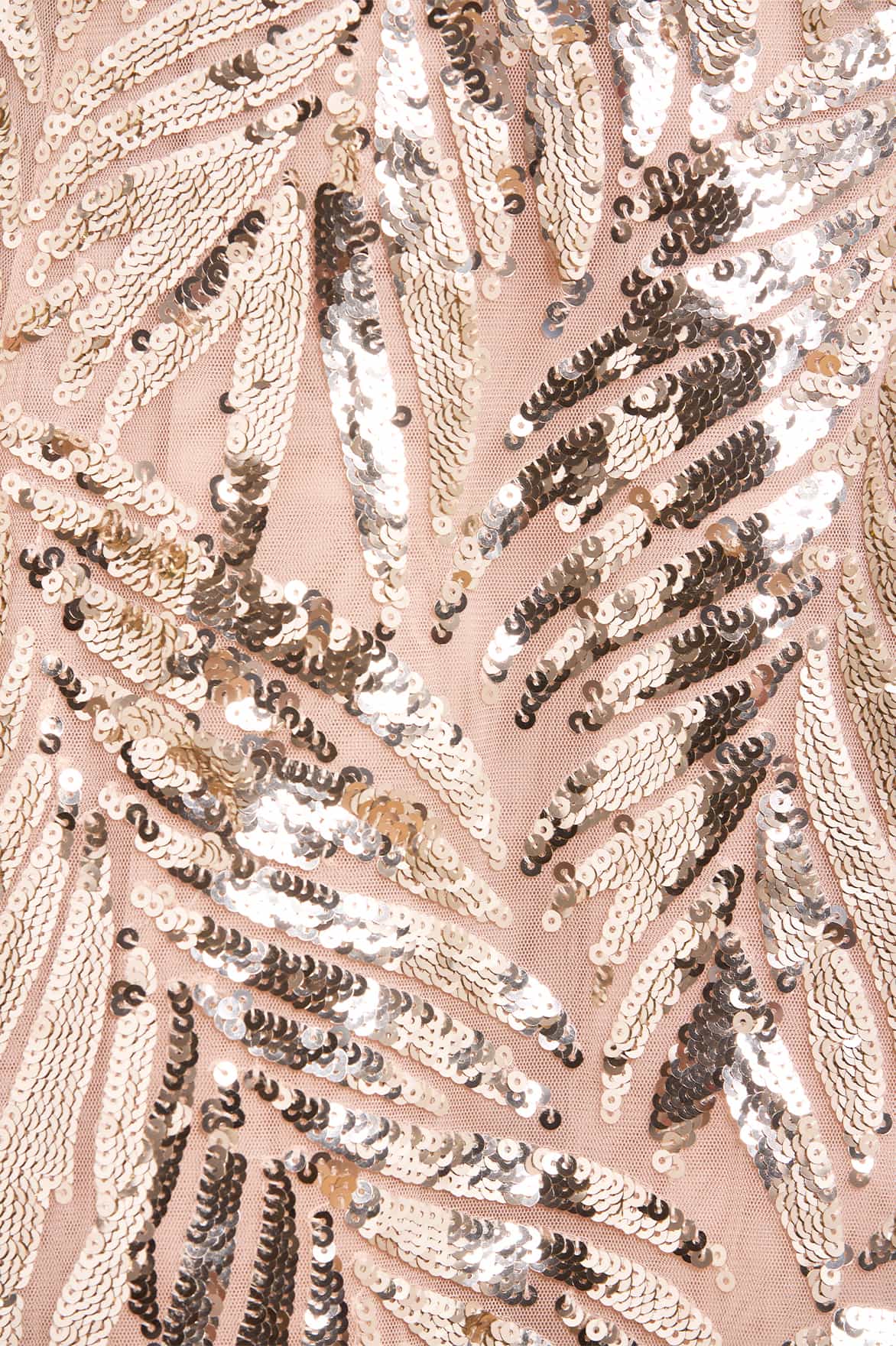 The Feather Sequin Strapless Ankle Gown in Beige/Silver. This show-stopping gown features statement feather sequin artwork inspired by costumes worn by the Follie’s dancers of the early 1900s. Beautifully designed with perfectly placed sequins gradually trailing towards the hem. Crafted with an elegant strapless design and signature Needle & Thread tulle frills at the neckline and shoulder. An internal corset construction in stretch power mesh ensures full comfort and fit while maintaining the garment’s shape. The skirt is developed with generous layers of net and tulle for a sweeping hemline. The perfect gown for an upcoming special occasion and beyond.