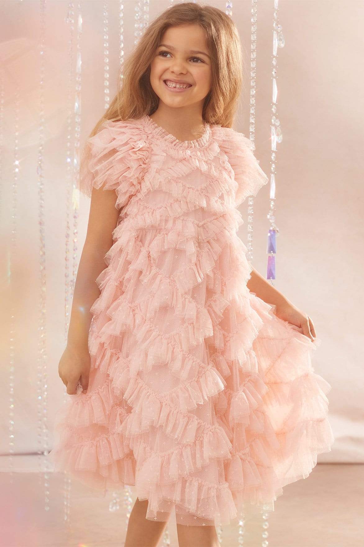 NEW SEASON | The Genevieve KIDS Dress in Petal Pink. This frothy textured dress is designed with playfully dramatic sleeves to create frilly fullness at the shoulders. It also features diamond stitch detailing resulting in a beautifully textile finish. Let your little one take centre stage in this statement piece.