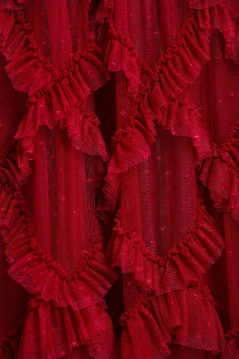 The Genevieve Rose Gown in Red. This statement gown is inspired by 1930s Hollywood glamour. Beautifully designed with diamond tulle details and trims. Crafted with multiple layers of ruffled, frothy tulle sculpted for dramatic effect. Make the ultimate style statement this season.