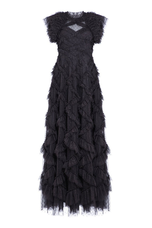 NEEDLE & THREAD EXCLUSIVE. The Genevieve Rose Gown in Graphite. This statement gown is inspired by 1930s Hollywood glamour. Beautifully designed with diamond tulle details and trims. Crafted with multiple layers of ruffled, frothy tulle sculpted for dramatic effect. Make the ultimate style statement this season.