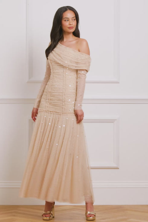 NEW SEASON. The Gigi Dot One-Shoulder Rouched Gown in Beige. A sculptural yet soft silhouette featuring delicate dotted tulle. The one-shoulder bodice is detailed with gentle ruching, while the skirt flows with subtle volume. An elegant choice for elevated evening events.