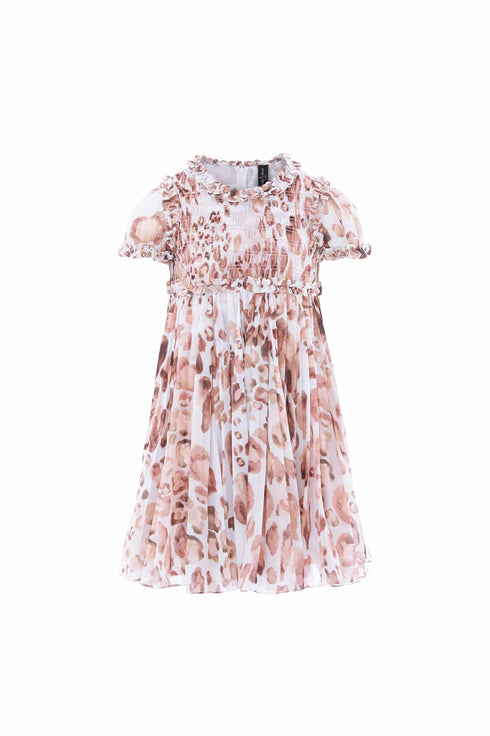 The Leopard Giselle Chiffon Kids Dress in Moonshine. Beautifully hand-painted in-house, this dress features a soft watercolor leopard print with varying motifs and delicate definition. Crafted from the softest chiffon, it has a shirred bodice adorned with signature Needle & Thread frills at the neckline, shoulders, and waist. The puff sleeves and ruffled cuffs add a charming touch. A fluid, delicately gathered skirt creates the perfect twirl-worthy silhouette.