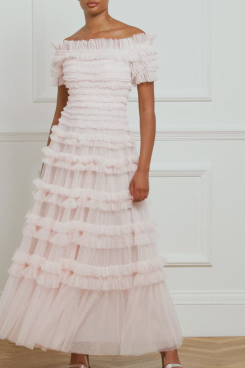 The Lisette Ruffle Off Shoulder Gown in Peony Pink. This statement gown has an elegant off-the-shoulder design inspired by Hollywood styling. Crafted with textile tulle and double-stitched frills for a dramatic, romantic effect. Features an integrated corset for a perfect fit and to hold the silhouette. Expect all eyes on you in this romantic gown.