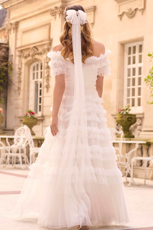 NEW SEASON | NEEDLE & THREAD EXCLUSIVE. The Lisette Ruffle Off-Shoulder Gown in Swan White. A statement off-shoulder gown adorned with cascading ruffles that enhance the silhouette with graceful movement. The softly structured bodice flows into a fluid skirt for timeless elegance.