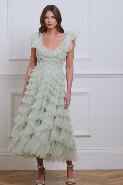 The Lola Backless Ballerina Dress in Mist, a beautiful new addition for the season. Adorned with signature Needle & Thread elements, this dress features soft tulle and delicately gathered frills, creating a frothy, engineered texture. The backless design adds a romantic, playful touch, while the ballerina-length skirt enhances its graceful silhouette. Perfect for weddings, birthdays, or any special occasion, this dress promises to be a showstopper.