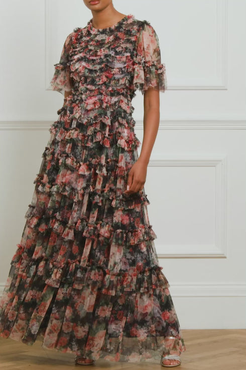 The Midnight Dance Round Neck Gown in Graphite. Beautifully printed with a floral design featuring luxurious blooms taken from archive, hand-painted artwork from the early 1900s. This style features pretty, engineered ruffle details perfectly positioned and inspired by Victorian styling. Crafted in signature Needle & Thread soft tulle for a romantic look. The skirt has a flattering fit that skims the body and gently increases in fullness, creating stunning movement within the tulle.
