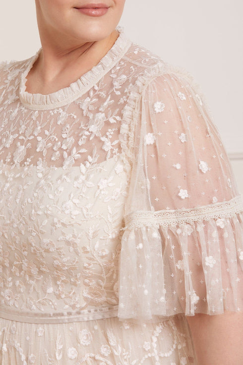 The Midsummer Lace Round Neck Gown in Champagne. A signature Needle & Thread style, with an updated neckline for the Taking inspiration from Victorian lace, the Midsummer features intricately embroidered artwork in tonal colours on delicate tulle. Beautifully developed with lace frills framing each tier of the skirt. This embroidered lace gown has sheer, romantic sleeves and our signature grosgrain ribbon at the waist. The perfect gown to take you from day to night.