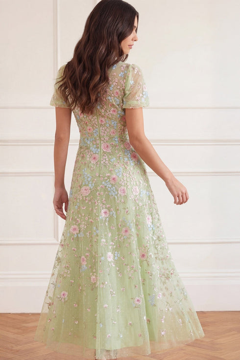 NEW SEASON. The Peony Bouquet Round Neck Ankle Gown in Peppermint/Multi. Exquisite floral embroidery inspired by archival garden paintings adorns this elegant ankle-length gown. Designed with a round neckline and softly flowing silhouette, creating a romantic finish for occasionwear.