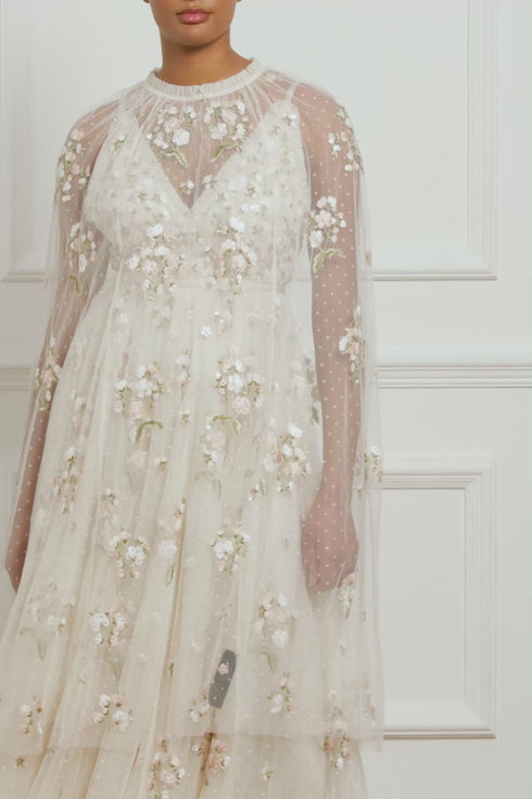 The Posy Midaxi Open Cape in Cream. This cape is adorned beautifully with clusters of intricate floral bouquets and shimmering sequins for a sparkling effect. This tulle cape is designed to style over the Posy Cami Gown and features a shaped edge at the front to reveal subtle gown detailing. The perfect styling piece.