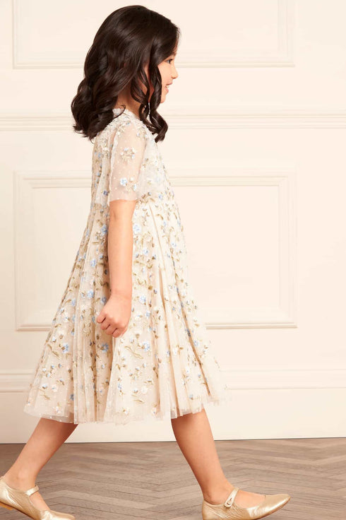 The Posy Pirouette KIDS Prom Dress in Cream / Blue. A brand new statement style for this season. Beautifully designed with intricate, rich embroidered artwork inspired by our ‘summer posy’ print. Developed with posy florals scattered all over and dispersing towards the hem, creating a pretty embroidery design. The skirt is made from generous layers of net and tulle, creating a sweeping hemline. The perfect dress for all their upcoming special events.