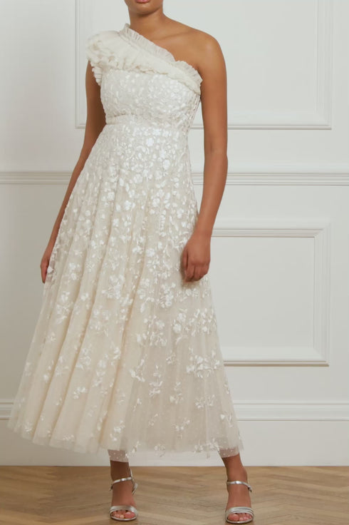 NEEDLE & THREAD EXCLUSIVE. The Posy Pirouette One-Shoulder Ankle Gown in Cream / Pink. A statement style for the season ahead. This gown is beautifully embroidered with intricate, rich posy florals scattered all-over and dispersing towards the hem. Developed with a one-shoulder design and adorned with soft, tulle ruffles adding a romantic finish. Crafted with a net tulle generous skirt with a sweeping hemline. A traditional yet stylish gown.