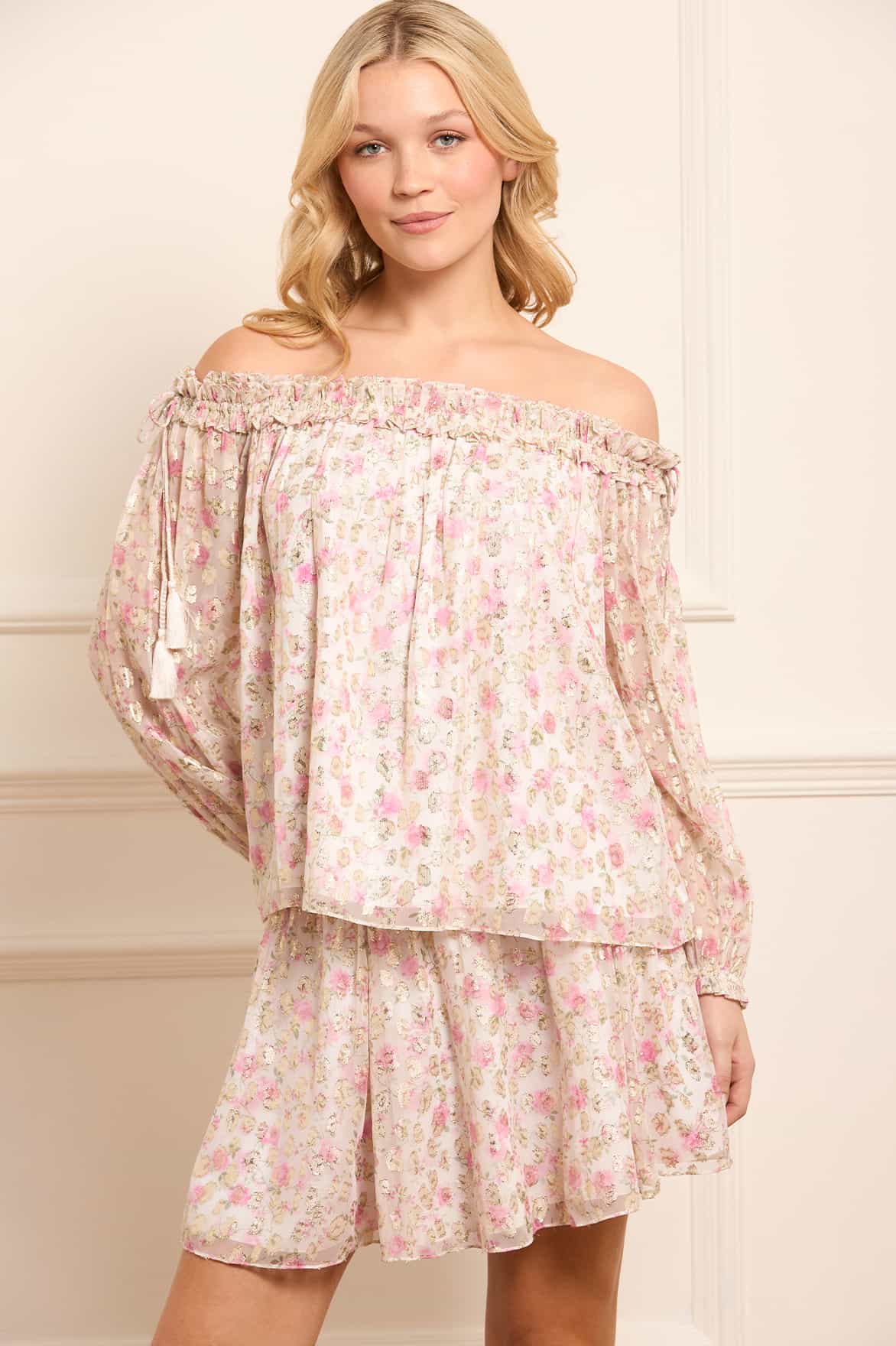 The Rose Ditsy Lurex Off-Shoulder Top in Moonshine/Pink. This top features a romantic floral print inspired by 1800s hand-painted wallpaper, with a subtle leopard print on glittering gold lurex georgette. The off-the-shoulder shirred neckline is edged with signature frills, while braided silk tassels add an elegant touch. Developed with blouson sleeves with ruffle cuffs enhance the romantic feel. With a relaxed fit, this top pairs perfectly with the Rose Ditsy Lurex Micro Mini Skirt for a complete look.