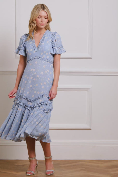 The Rose Ditsy Satin V-Neck Ballerina Dress in Sky Blue/Cream. This dress features a romantic floral print inspired by an 1800s hand-painted wallpaper. Crafted in luxurious satin, it showcases signature Needle & Thread frills at the neckline, shoulders, waist, and cuffs. The fluted sleeves and chevron-edged satin frills on the skirt add a soft, feminine touch. With a flattering V waist seam and slim, graceful silhouette, this dress offers timeless tea dress elegance and charm.