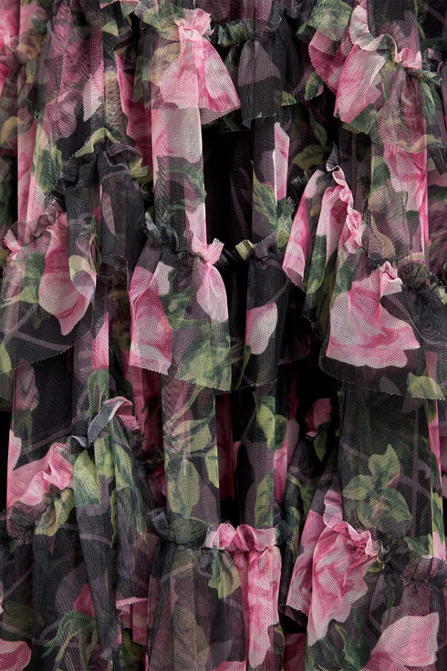 NEW SEASON. The Rose Vine Aviana Off-Shoulder Gown in Graphite. Blending the sculptural tulle frills of Needle & Thread’s signature Aviana silhouette with embroidered rose vines, drawn from 19th-century prints. Rows of scallop frills add texture and volume, while the off-shoulder neckline frames the décolletage. The trailing rose embroidery softens the silhouette, this gown captures the mystery and grandeur of the Bright Star collection.