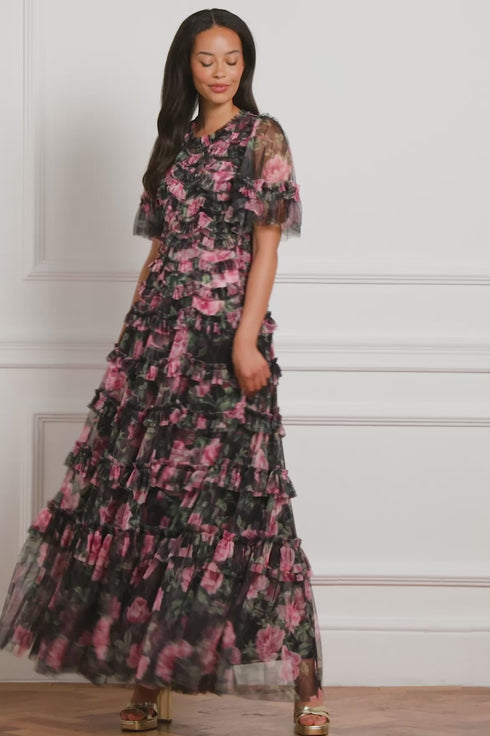 NEW SEASON. The Rose Vine Round Neck Gown in Graphite. Layers of tulle are adorned with delicate embroidered rose motifs, creating a gown that feels painterly and poetic. With a round neckline and slim silhouette, the graphite colourway enhances its mystery and sophistication.