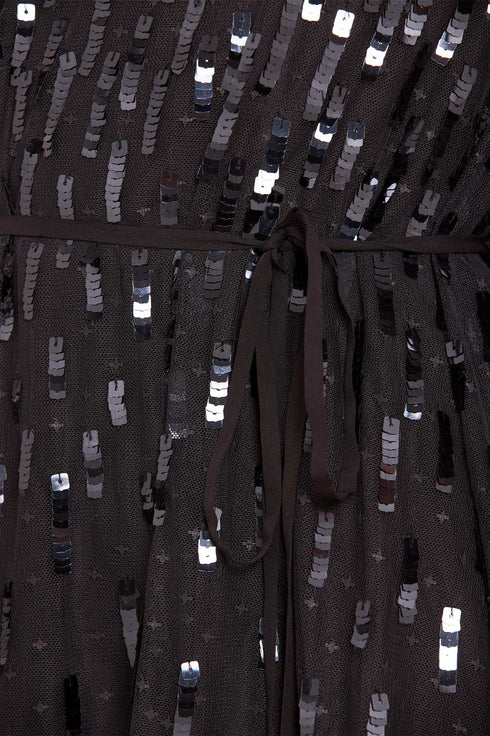 The Sequin Dash Mini Dress in Graphite. This mini length dress is adorned with statement, square sequins in a staggered linear layout creating a shimmer throughout. Developed with a loose silhouette for an effortless, floaty feel featuring voluminous sleeves for a romantic look. The perfect dress for an upcoming special occasion.