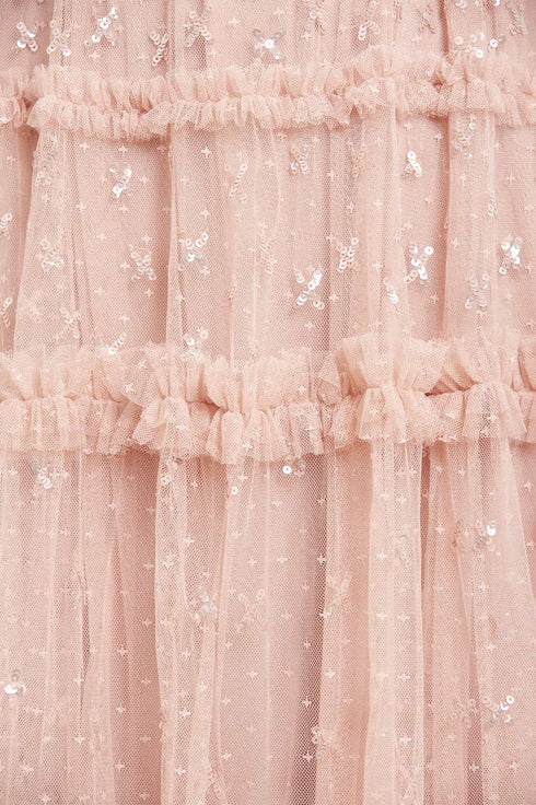 The Sequin Kisses Ankle Gown in Pebble. Beautifully adorned with intricate star motifs scattered throughout, creating an enchanting, shimmering effect. This flattering gown is developed with a smocked waist, long sleeves and tulle frill detailing. Designed with elasticated cuffs and a keyhole neckline for an effortless look. The perfect gown for an upcoming special occasion.