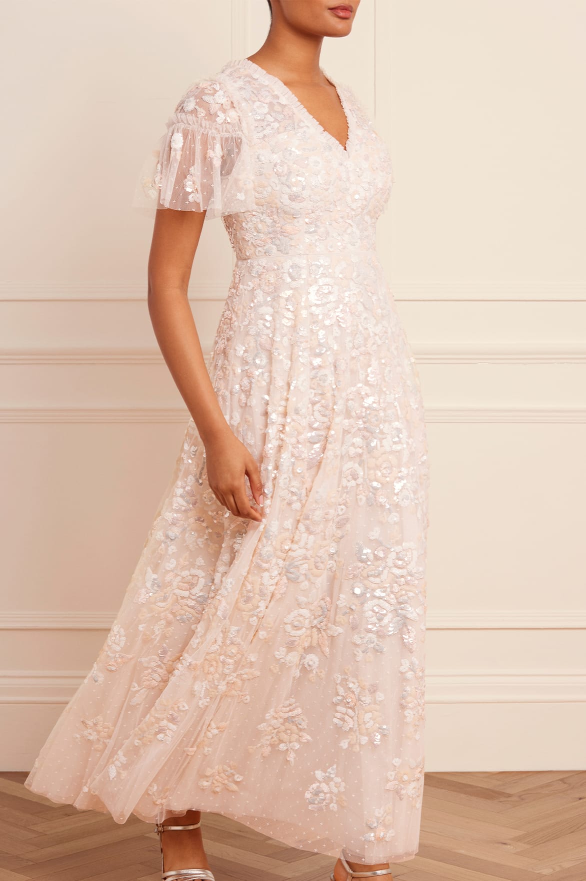The Sequin Paradise Short Sleeve Gown in Cream. This gown is beautifully embellished with an intricate sequin artwork, inspired by one of our key prints - paradise garden. The sequins are depicted in rich tones of pink and greens creating this enchanting floral artwork. Developed with generous layers of net to create a show-stopping skirt shape. A true Needle & Thread statement piece.
