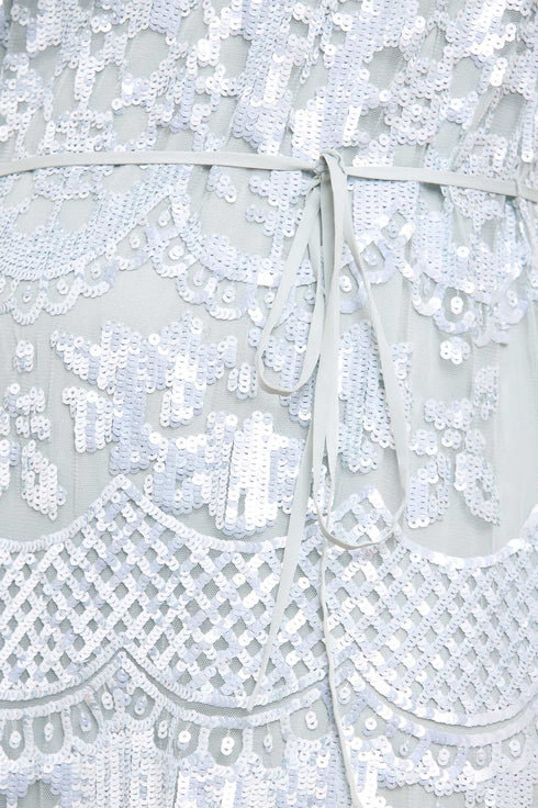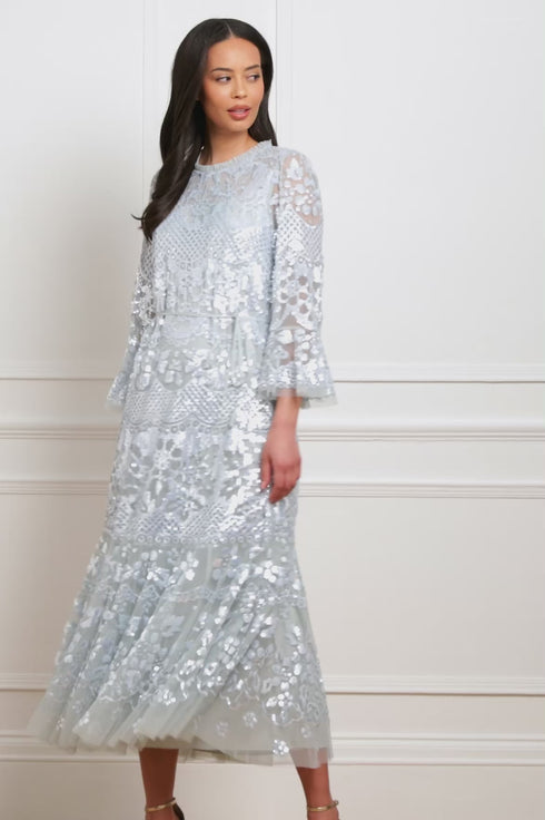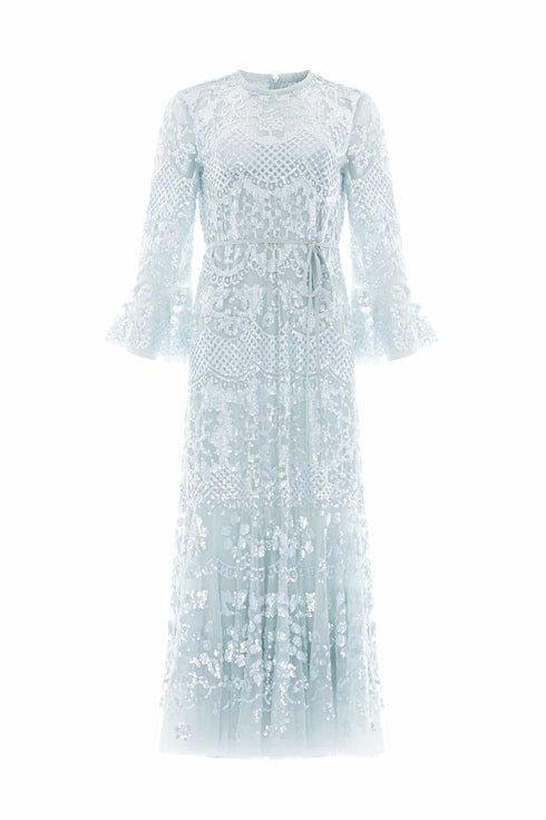 The Snowdrop Ankle Gown in French Blue. A heritage Needle & Thread design, this timeless gown features shimmering sequin artwork inspired by antique tablecloths from the early 1900s. Intricate floral borders and lattice patterns create a striking, heirloom-like embellishment. Designed for effortless elegance, the gown has a relaxed fit with a slim crepe waist tie for versatile styling. Crafted with romantic fluted sleeves, a softly tiered hem, and signature frill detailing at the neckline complete the look.