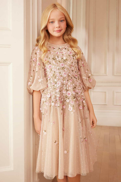 NEW SEASON. The Sylvia Rose Kids Dress in Oyster/Multi. A painterly interpretation of heritage florals. Crafted in layers of soft tulle, the dress is embroidered with delicate roses in multi-tonal threads scattered across an oyster base. The silhouette allows ease of movement while retaining Needle & Thread’s signature elegance. Pair with the Sylvia Rose Round Neck Ankle Gown in Oyster/Multi from the womenswear line for a coordinated family look that celebrates timeless romance.